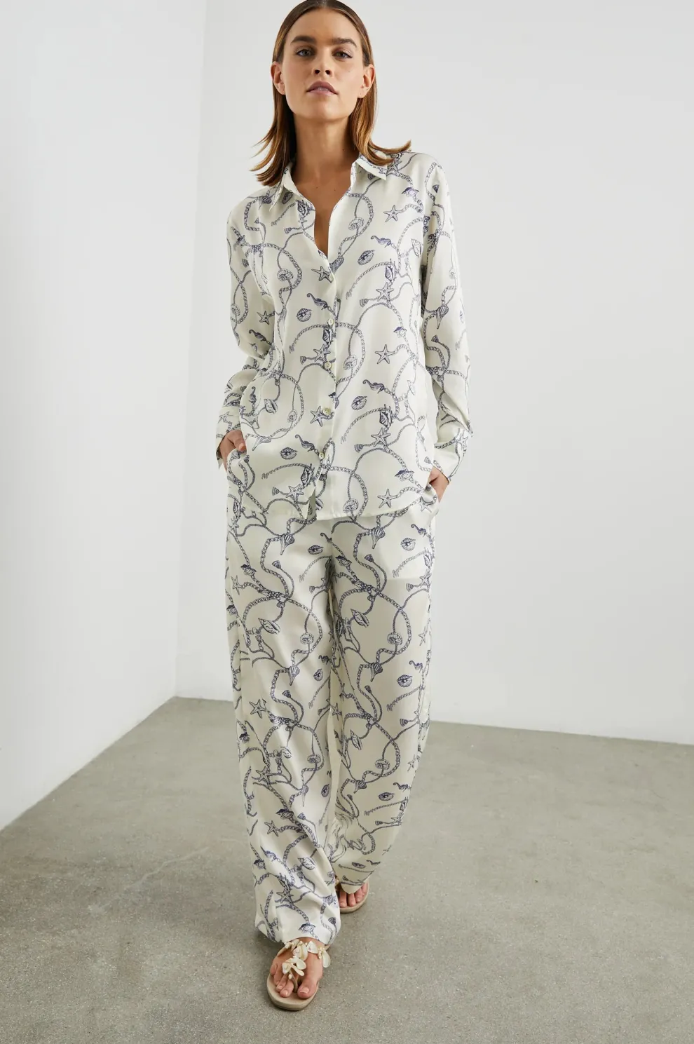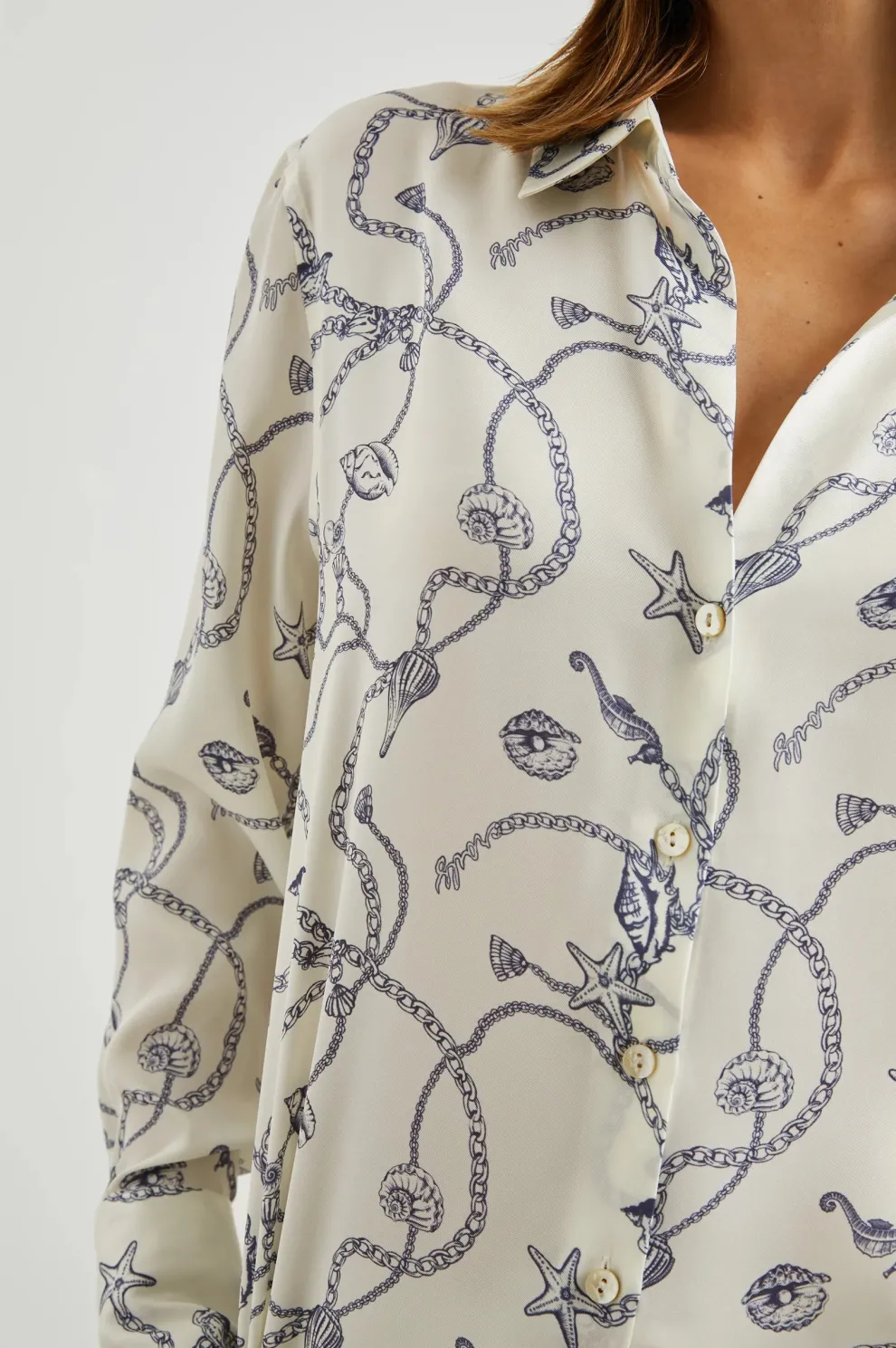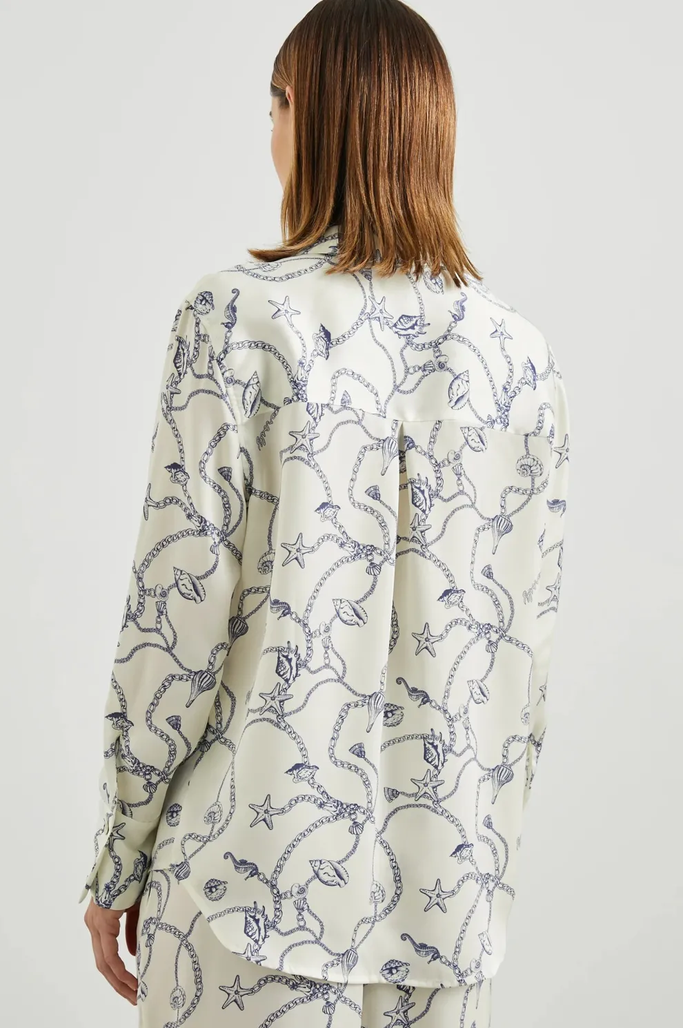 Fabriquée dans un twill brillant, cette chemise à boutons douce et élégante présente une coupe décontractée avec un motif d’inspiration nautique. Rentrez-la ou superposez-la sur un débardeur.