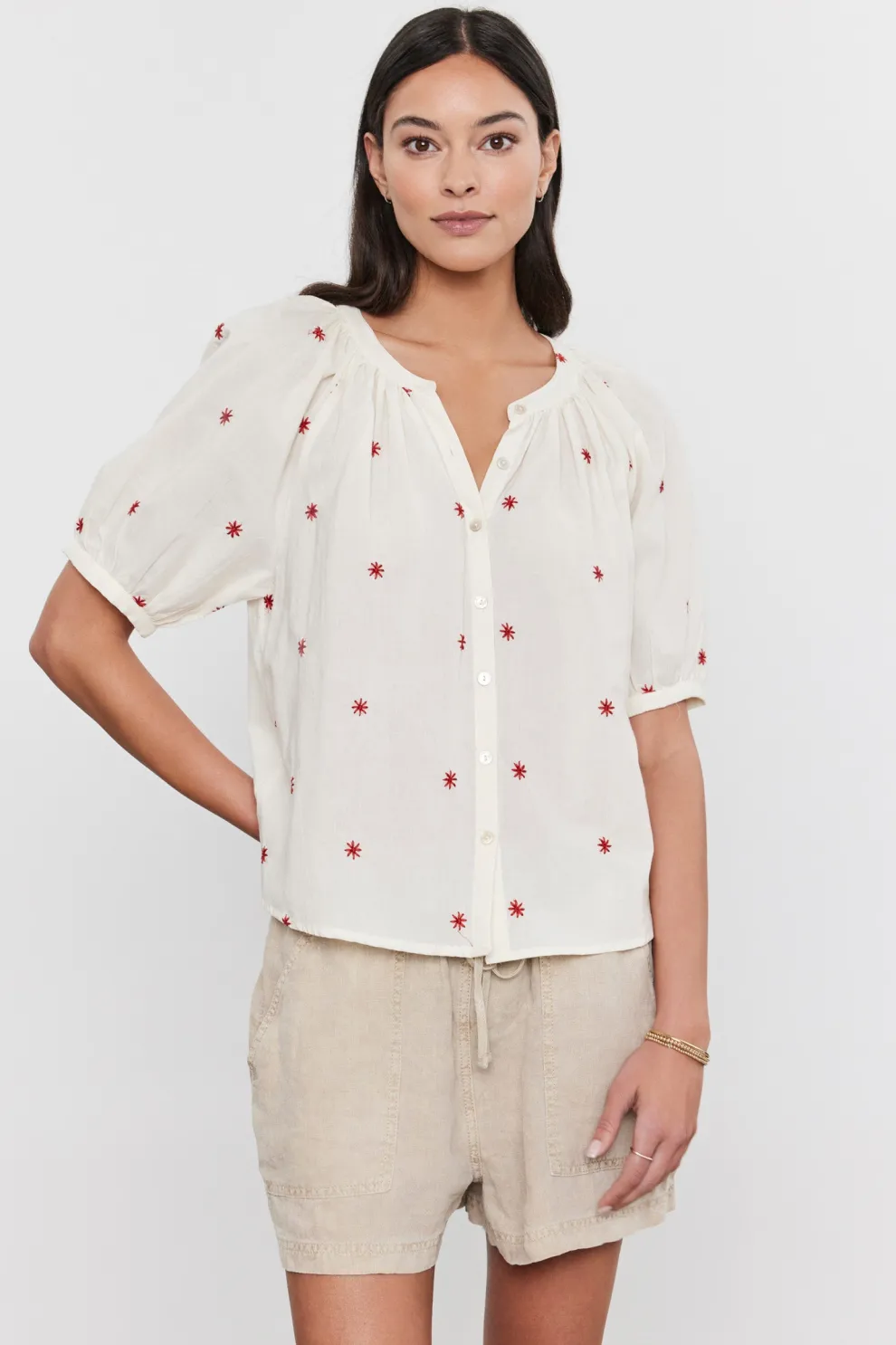 La chemise à manches bouffantes Amira est conçue dans un coton léger avec un détail de broderie floral.