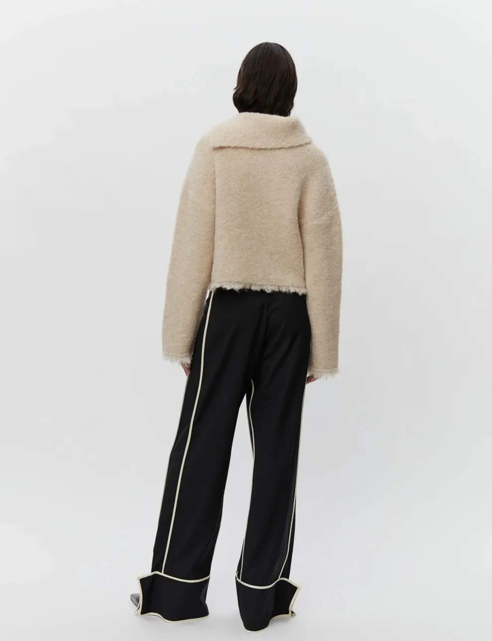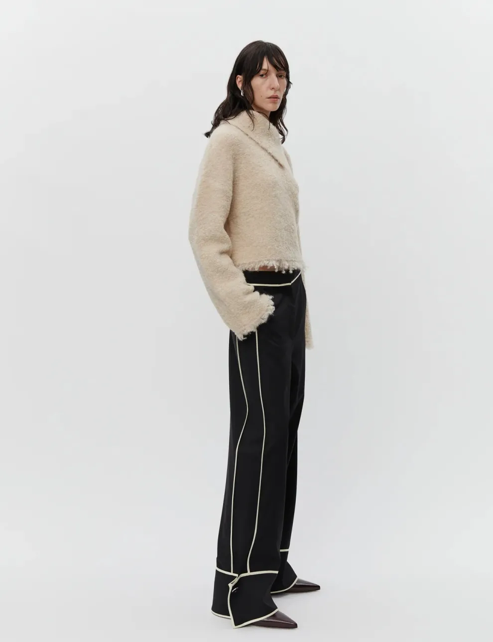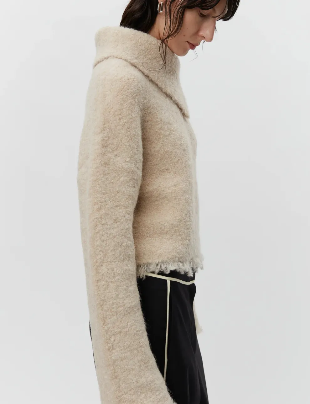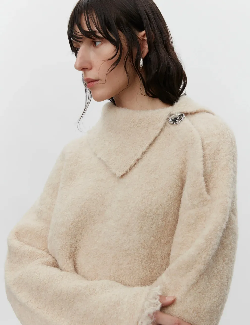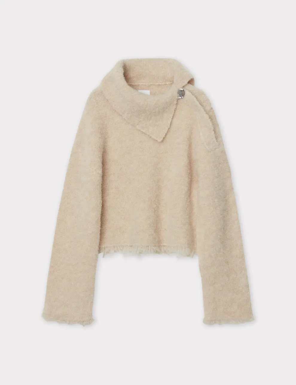 Ce pull épais en bouclé extensible présente un col asymétrique, un grand bouton boule à l’épaule, ainsi que des franges à l’ourlet et aux poignets. Le pull a une coupe ample.