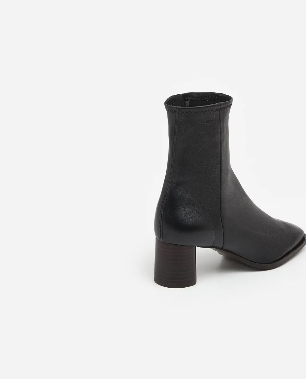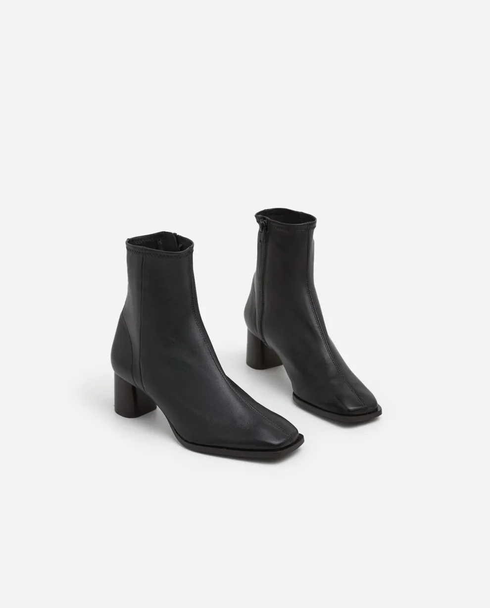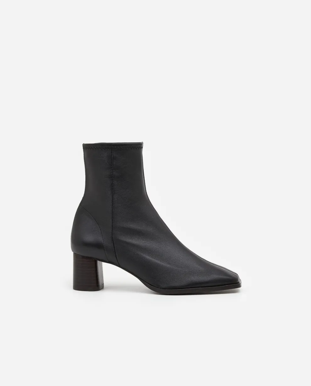 Square toe, visible stitching, side zipper, sleek shape, boot heel, slip-on design