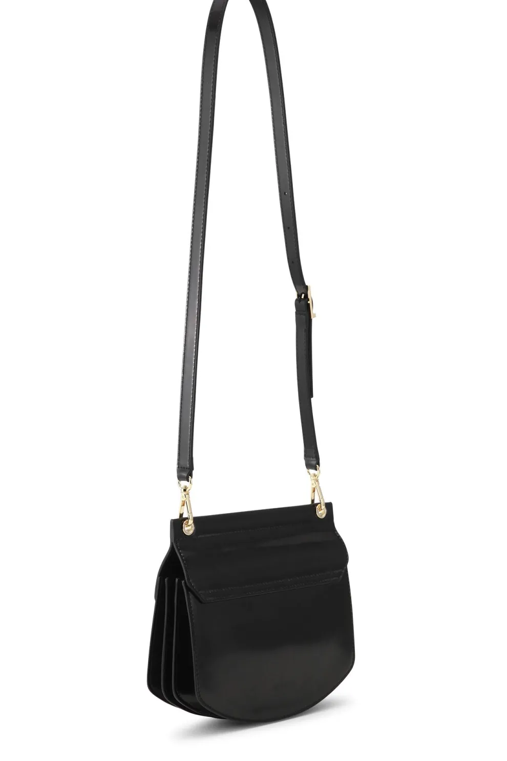 Ce petit sac Apo-G est de couleur noire avec une finition brillante. Le sac dispose d’une fermeture magnétique avec un fermoir en métal doré en forme de papillon GANNI et d’une bandoulière amovible, permettant de le porter de manière polyvalente en sac à épaule ou en pochette. L’intérieur compact comprend une poche plaquée et trois compartiments principaux, dont un avec une fermeture éclair.