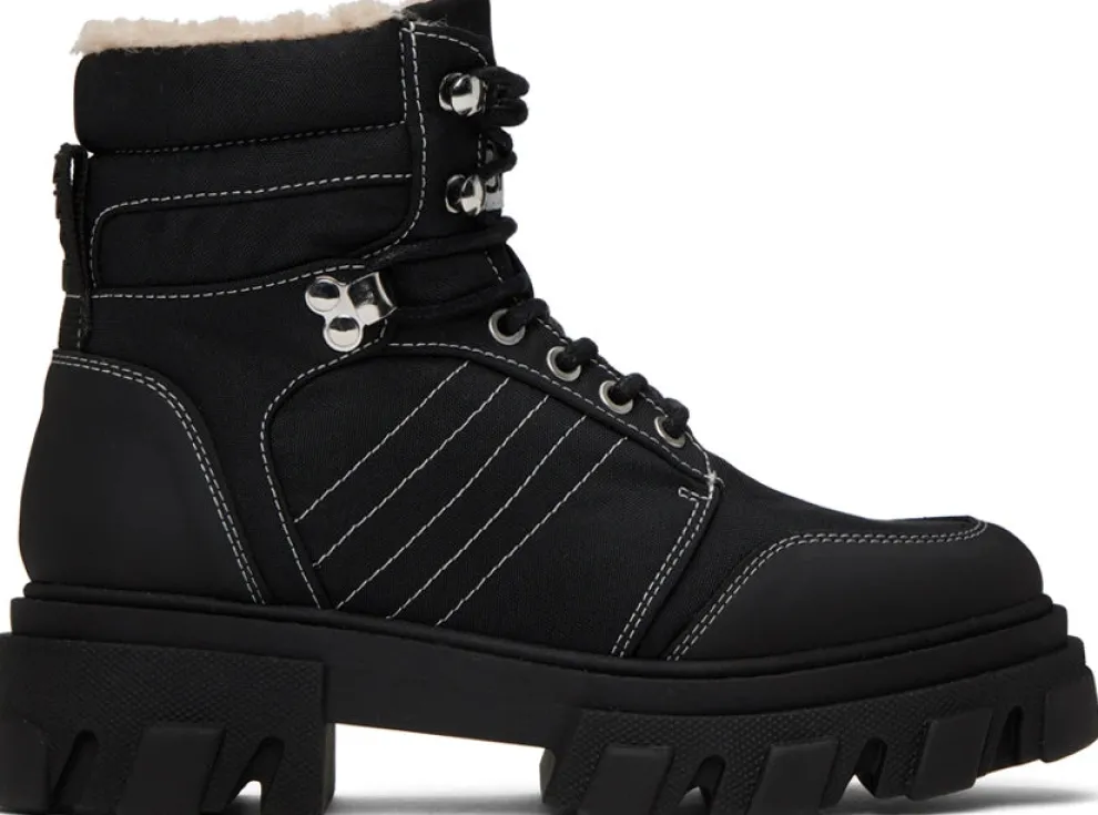 The lace-up hiking boots feature a lace-up front closure, round toe, heel pull tab, chunky soles and GANNI logo.
