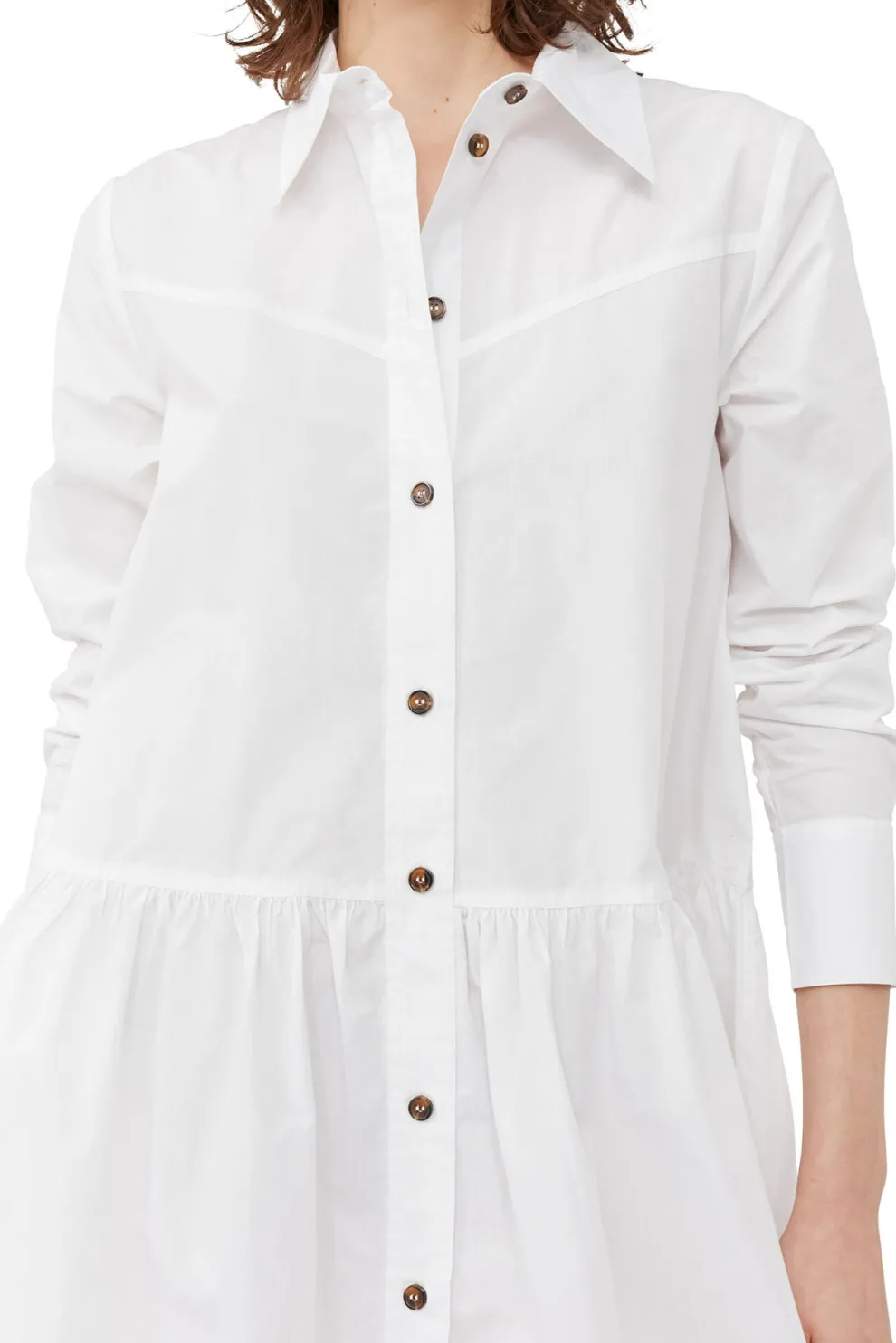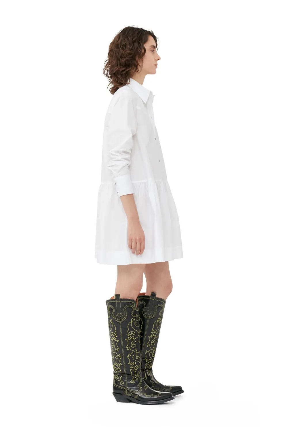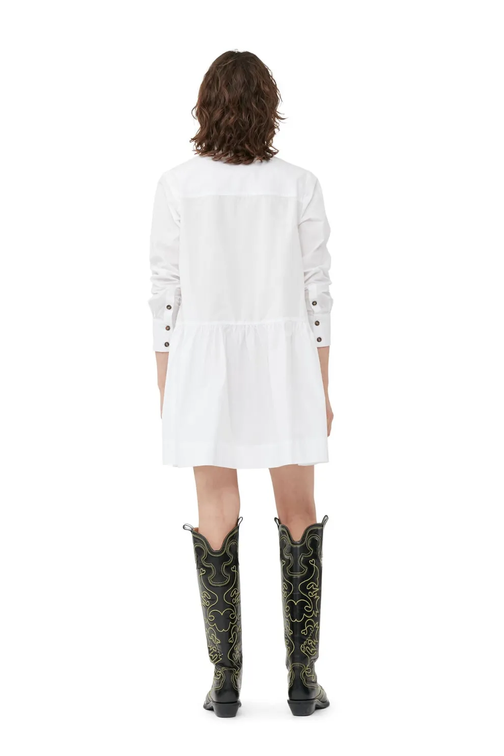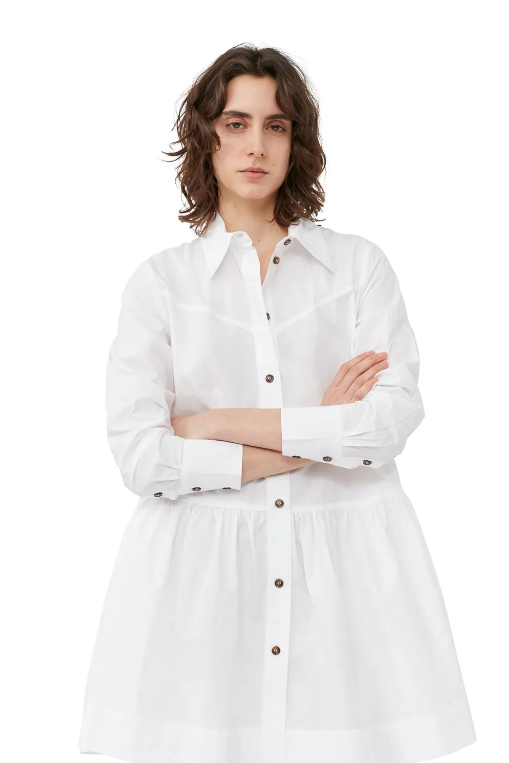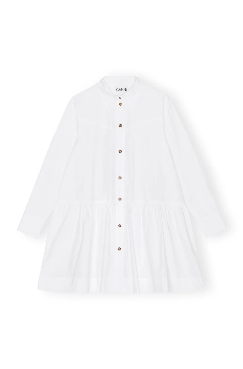 This white cotton poplin mini shirt dress is made from organic cotton. The dress is designed for a classic fit and features a collar, button fastening and long sleeves with buttoned cuffs.