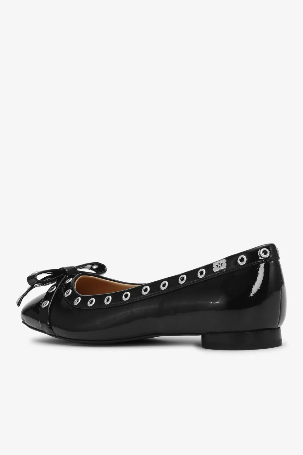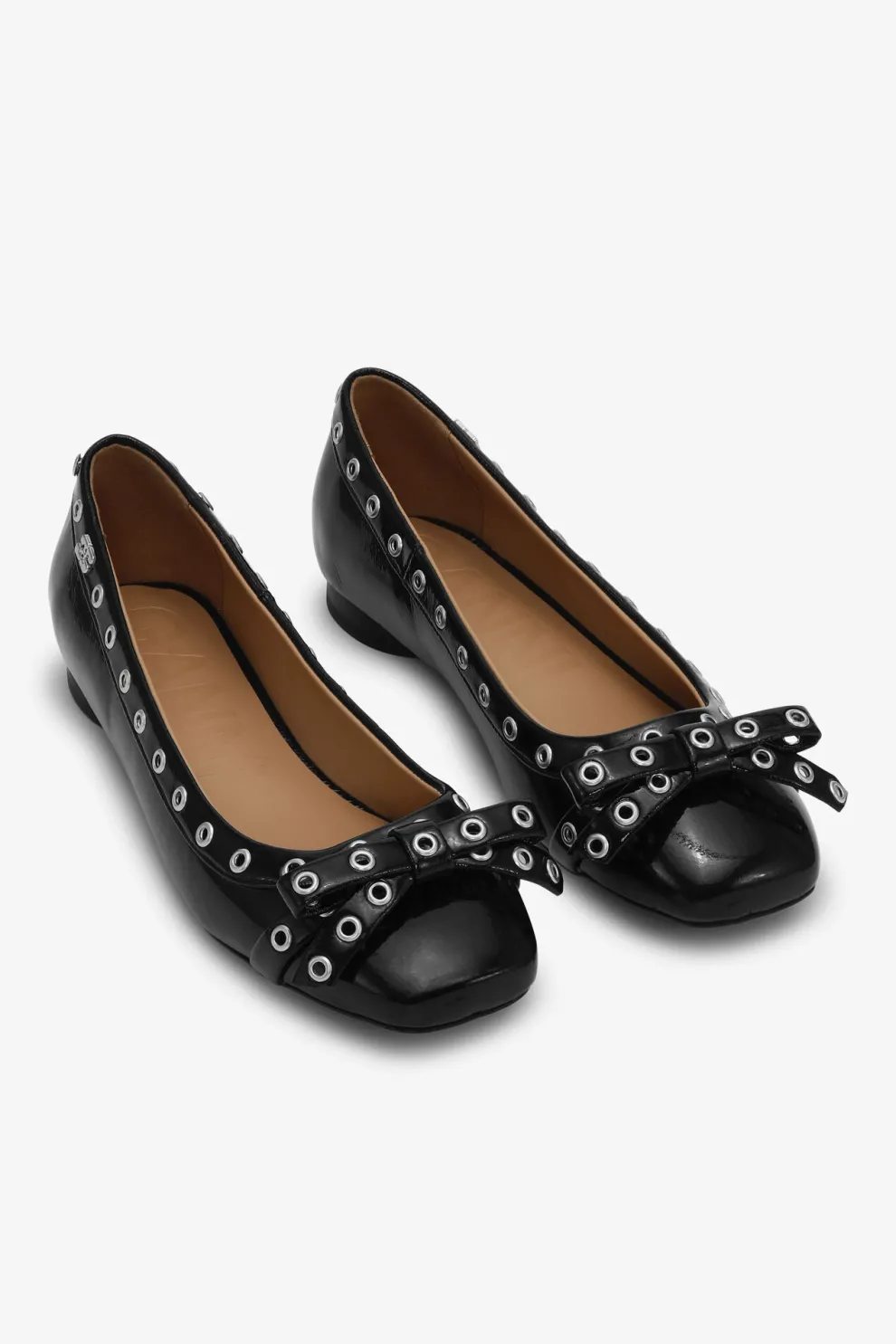 Ces ballerines noires avec œillets métalliques présentent un bout carré arrondi, un nœud décoratif et des œillets en métal.