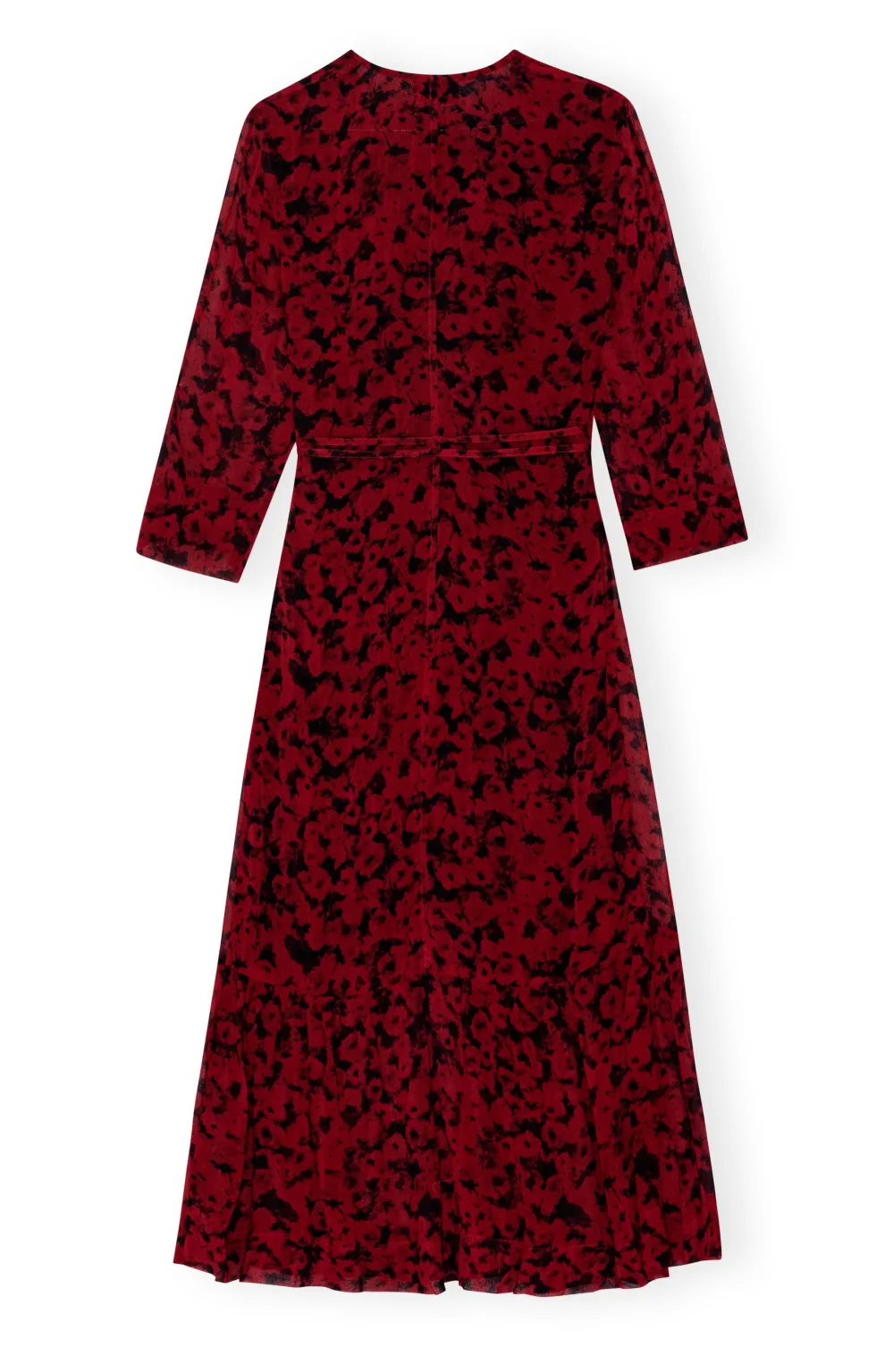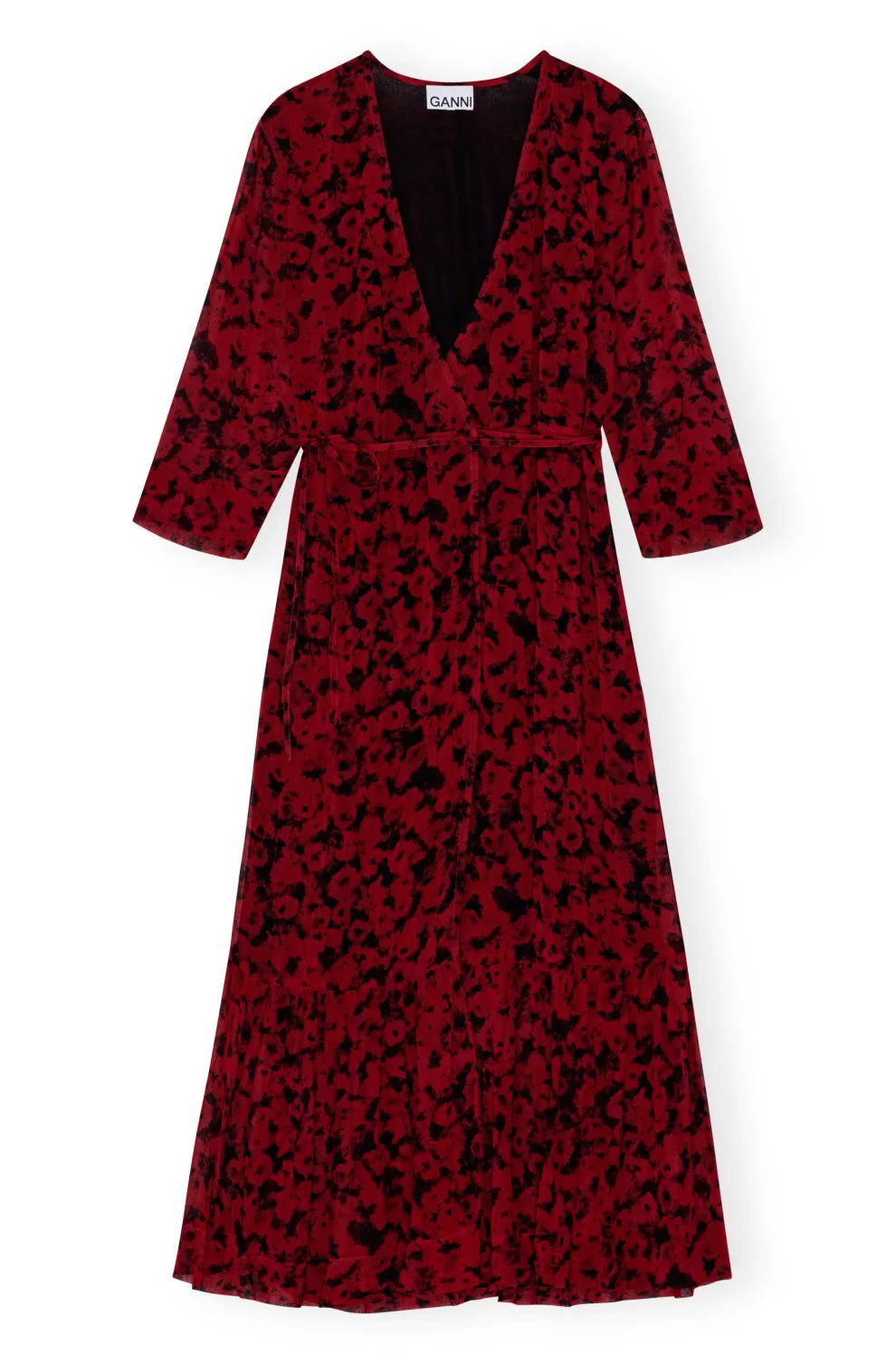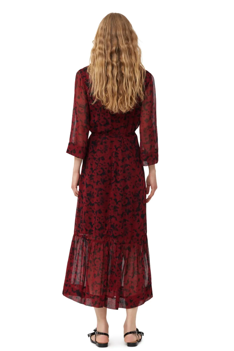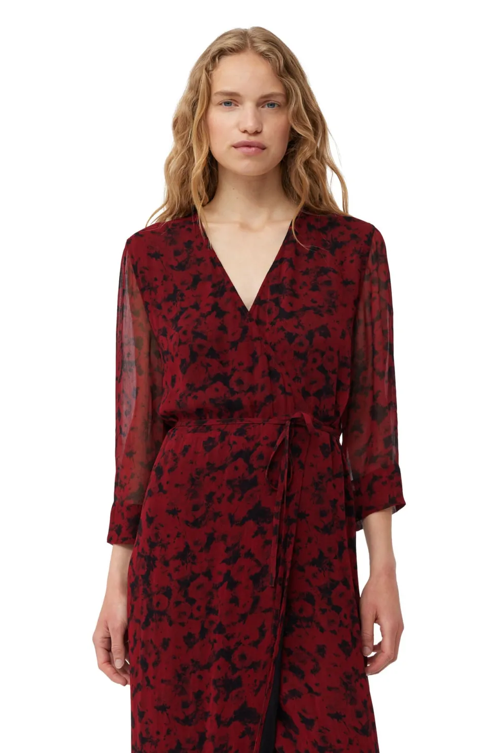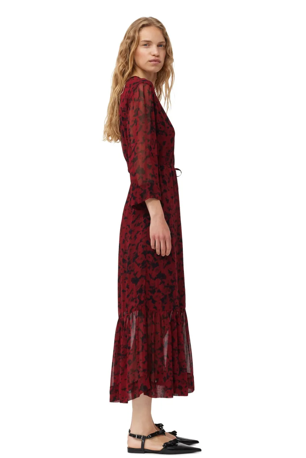 Cette robe midi cache-cœur en georgette légère imprimée rouge est confectionnée en viscose. La robe est conçue pour une coupe classique et présente une encolure en V, des manches transparentes mi-longues, une bande à nouer enveloppante et un ourlet volanté.