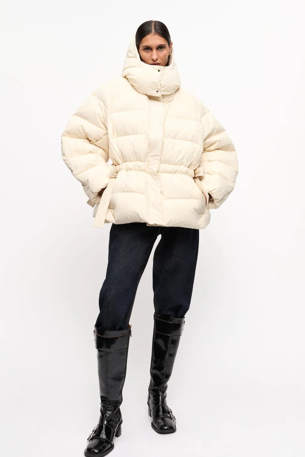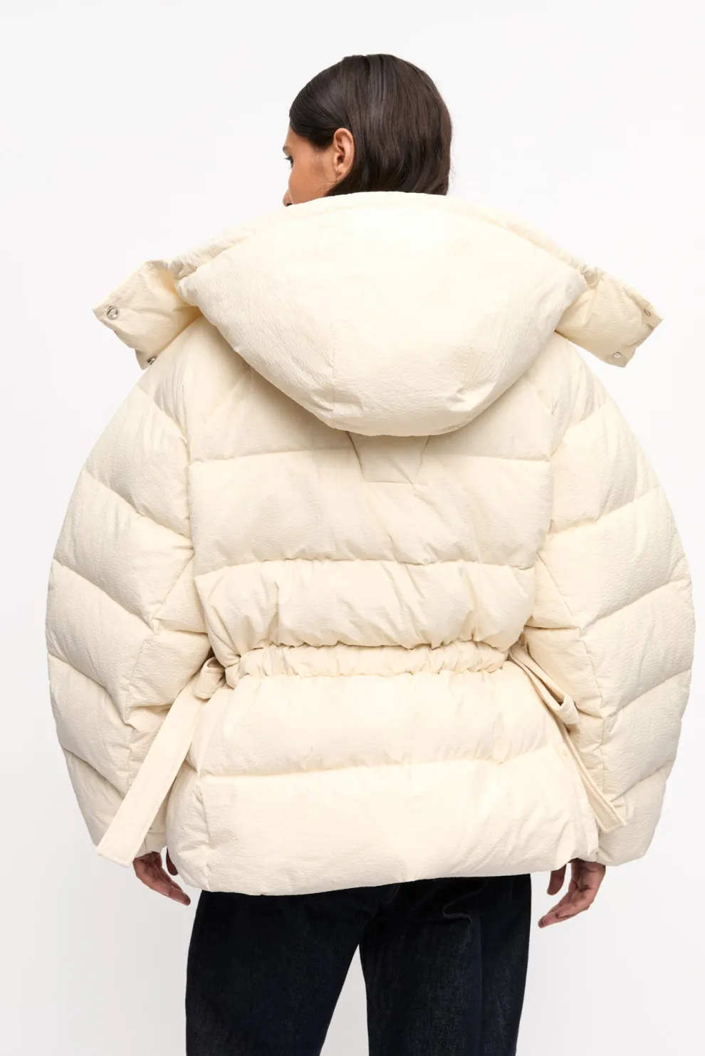 Cette doudoune technique blanche oversize est dotée d’un col montant et d’une capuche. Le manteau dispose d’une fermeture éclair sur le devant avec une patte dissimulée, de liens réglables à la taille et de poches latérales.