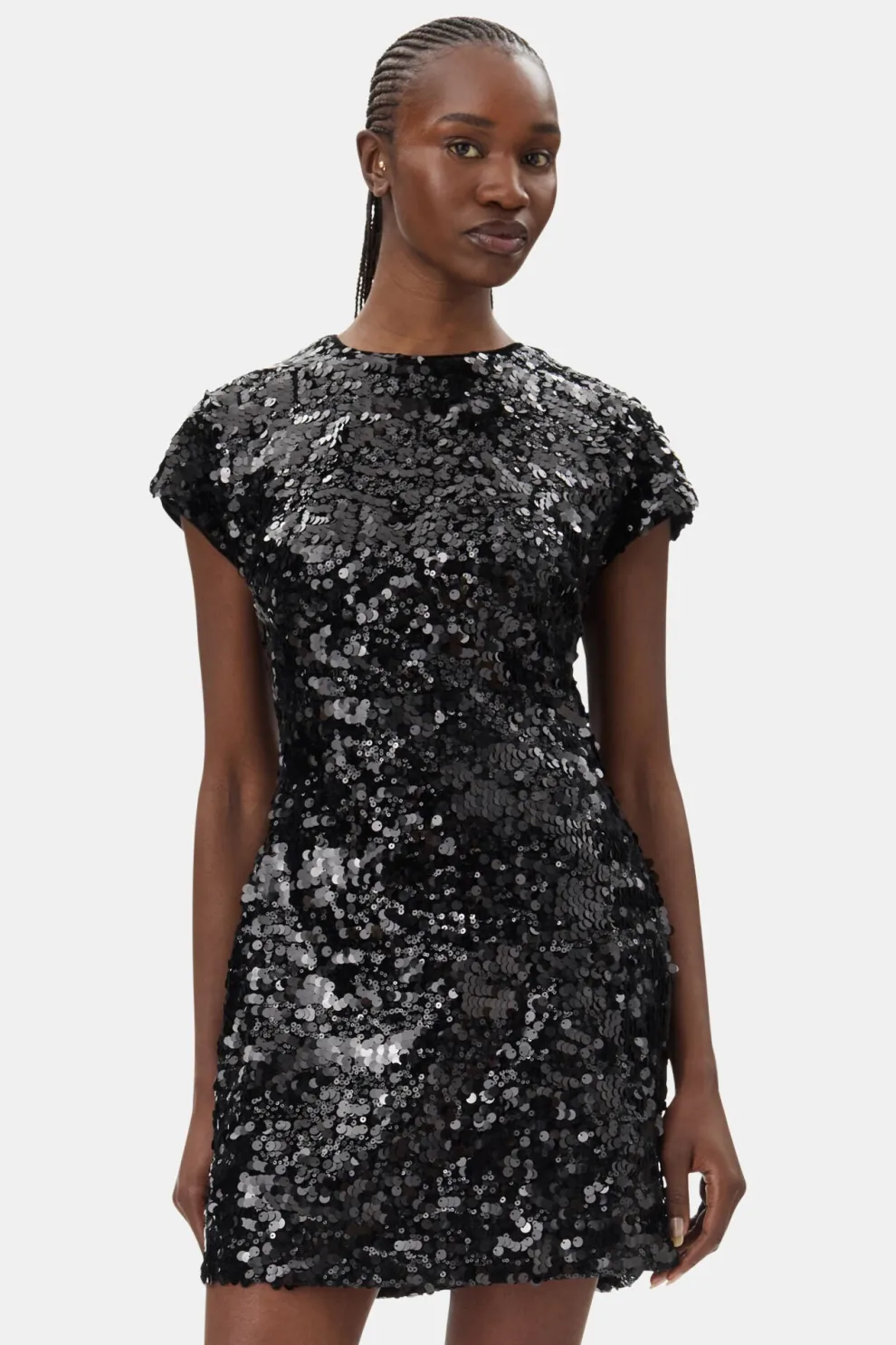 Cette mini-robe noire en velours ornée de sequins présente un col rond haut et des manches courtes. La robe est dotée d’un dos ouvert avec un détail à nouer.