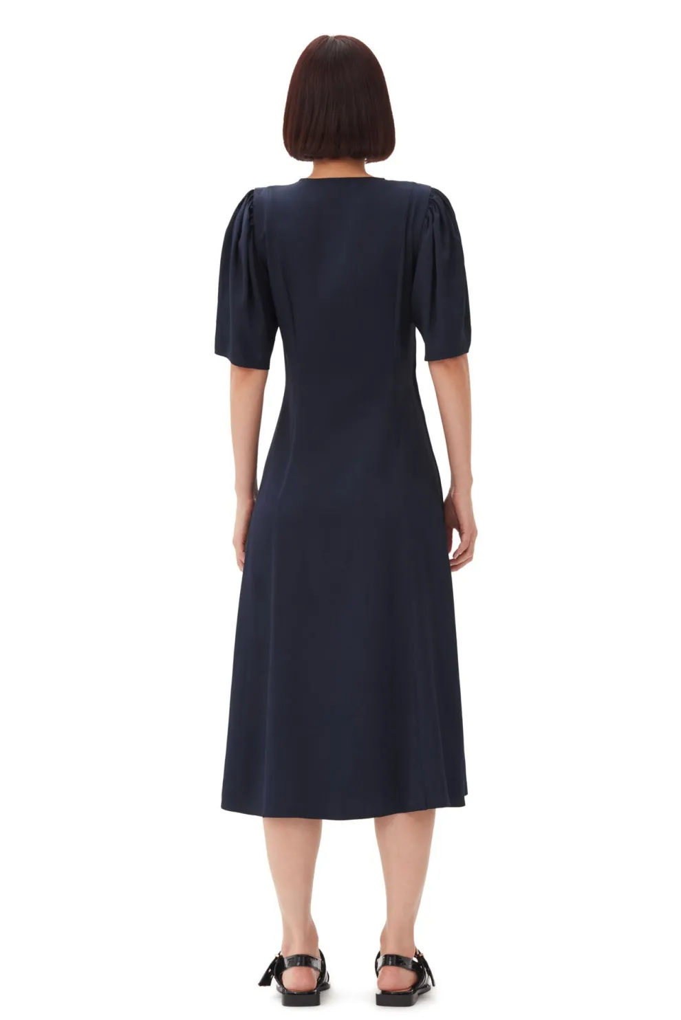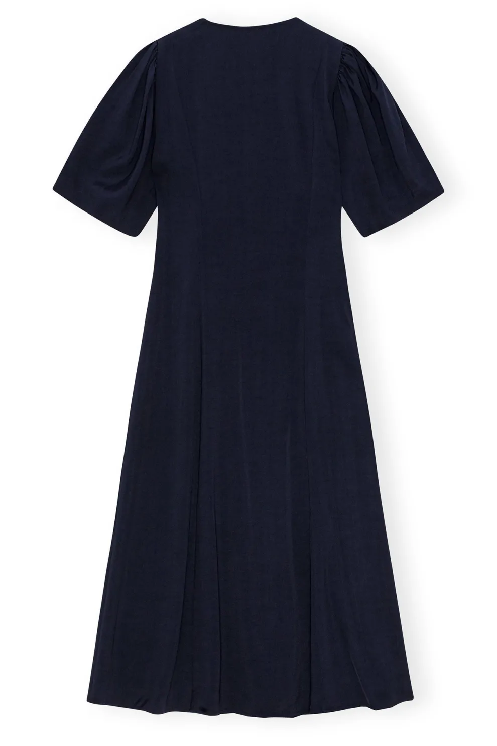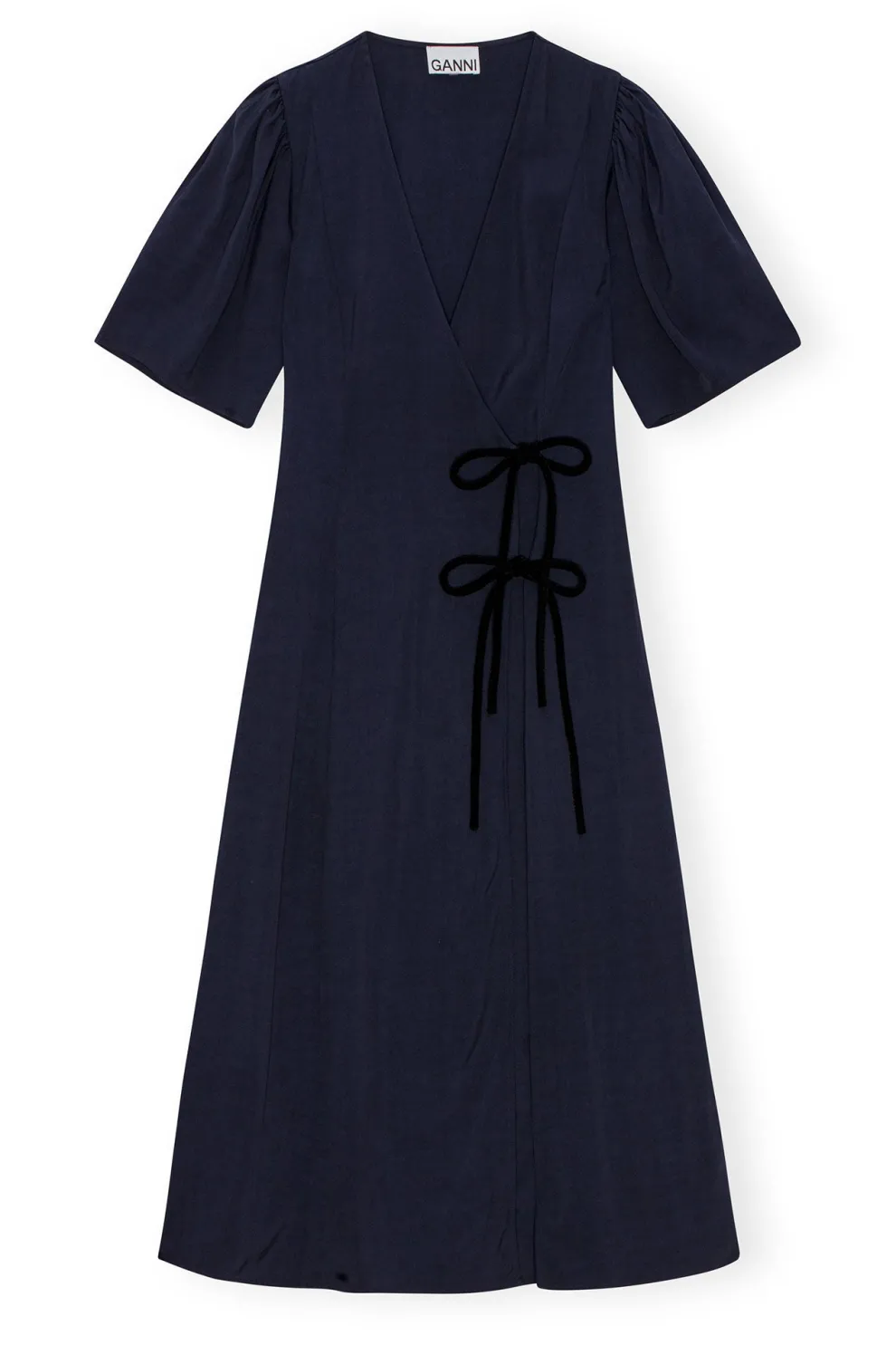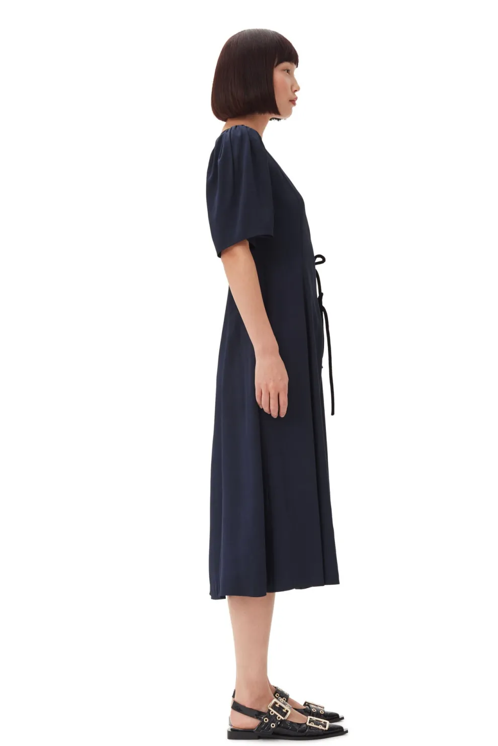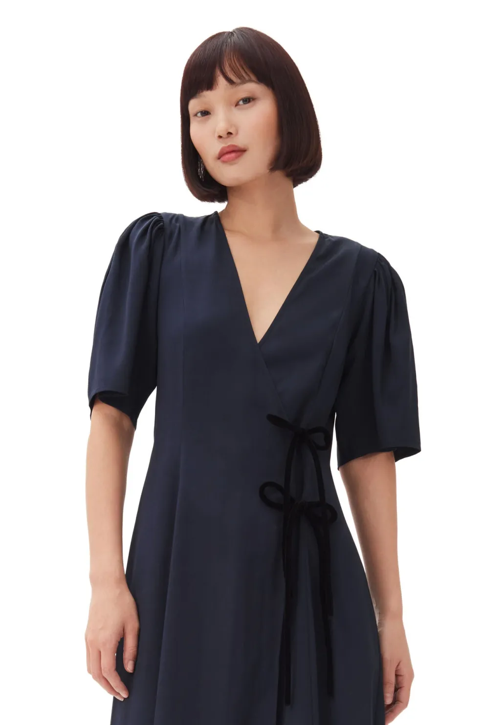 Cette robe midi en viscose bleue marine, en twill, présente un décolleté en V et des manches courtes. La robe est de style cache-cœur avec un détail en noir à nouer qui forme un nœud sur le côté.