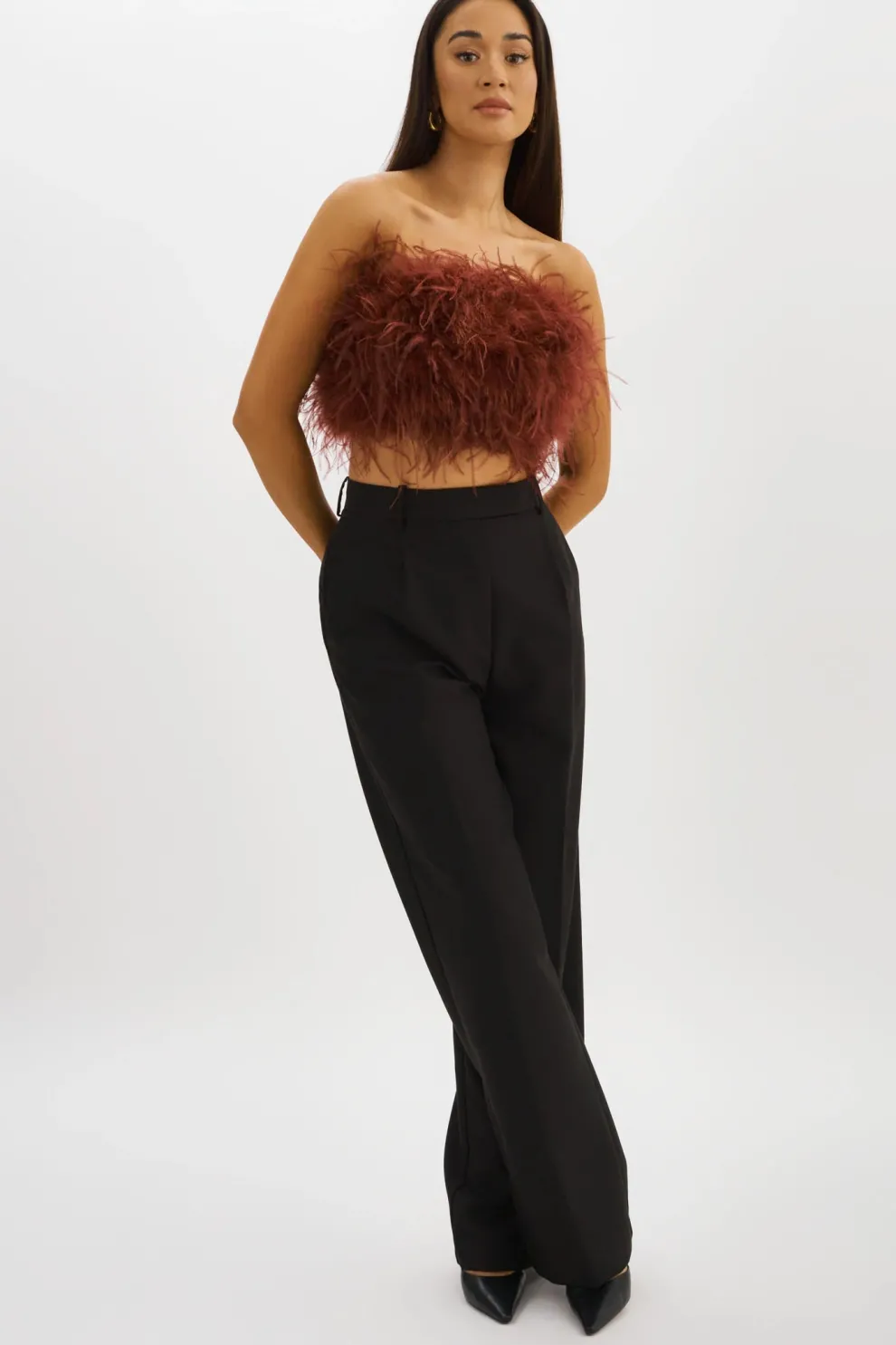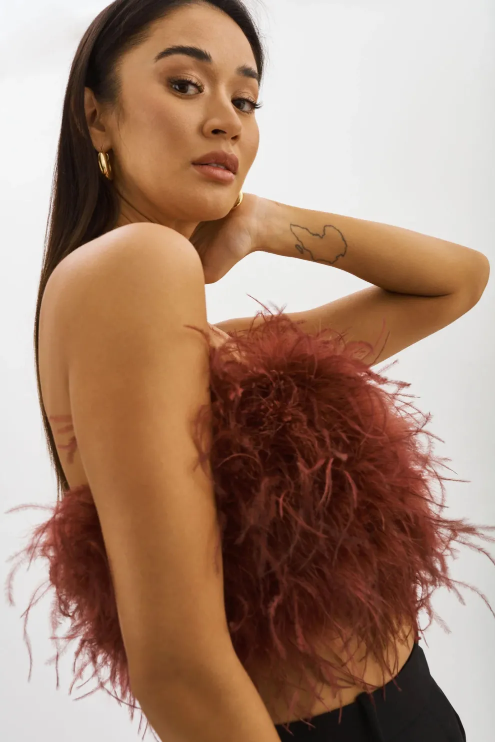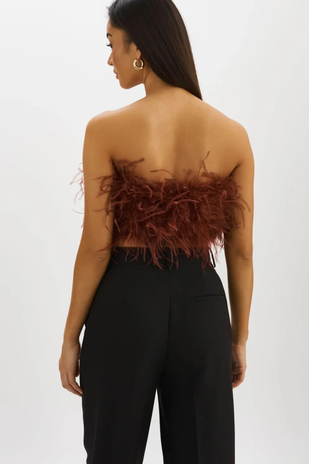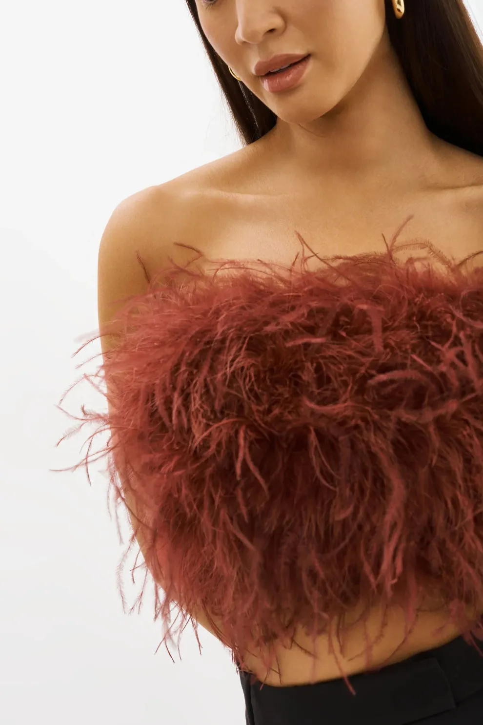 For a more sumptuous style, opt for the Zaina cropped bustier. Mixed feathers provide eye-catching movement and alluring texture. A zipper at the back ensures a close fit.