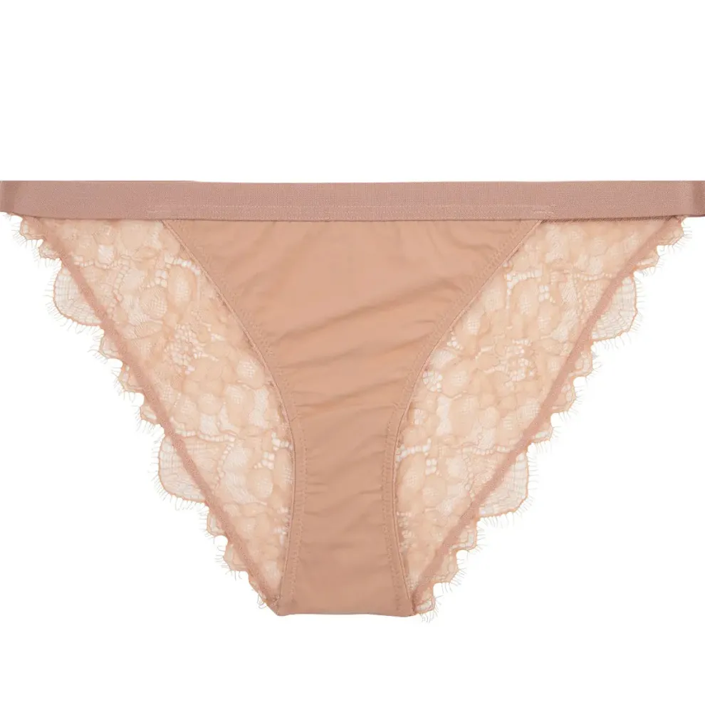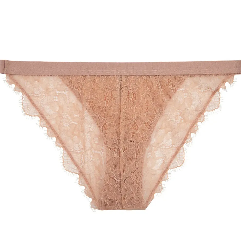 Thong style briefs in light brown. Cut from a soft, stretchy fabric. The back is made from semi-sheer floral lace.