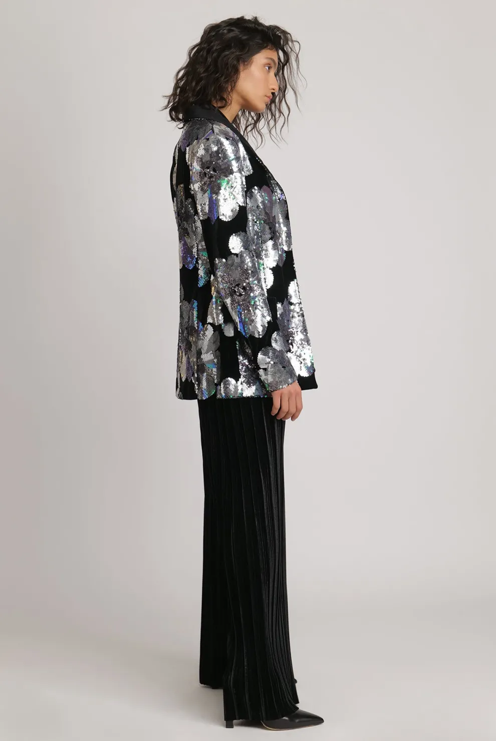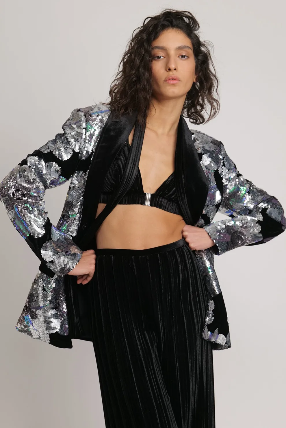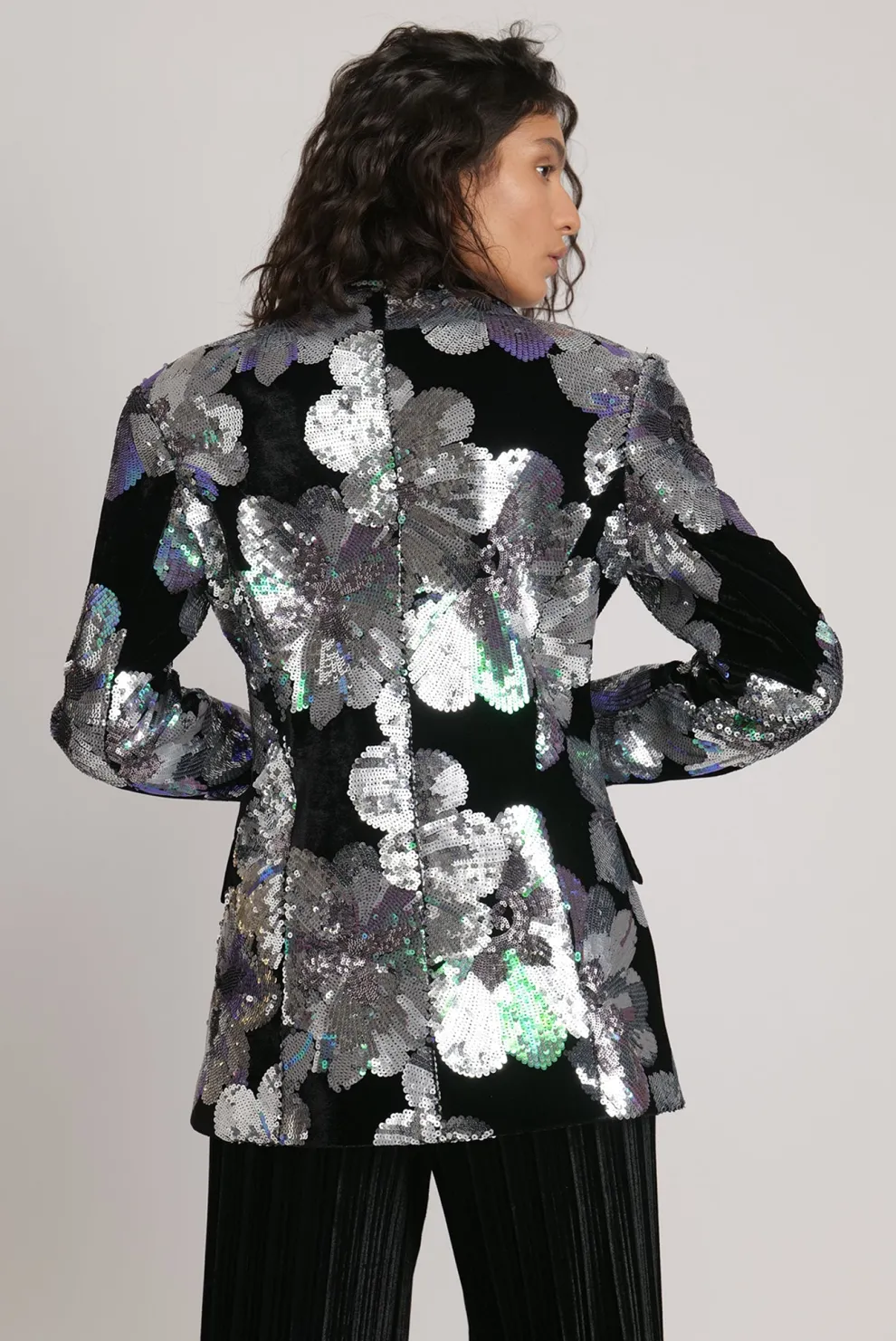 Velvet dress jacket decorated with floral sequins, with a front pocket and a detachable belt.