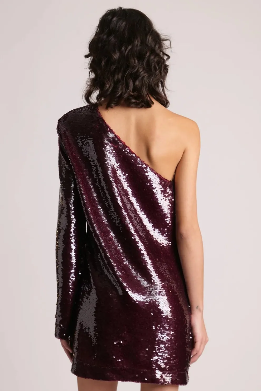 Short sequin dress with an asymmetrical neckline and long sleeves, featuring an invisible zipper on the side.