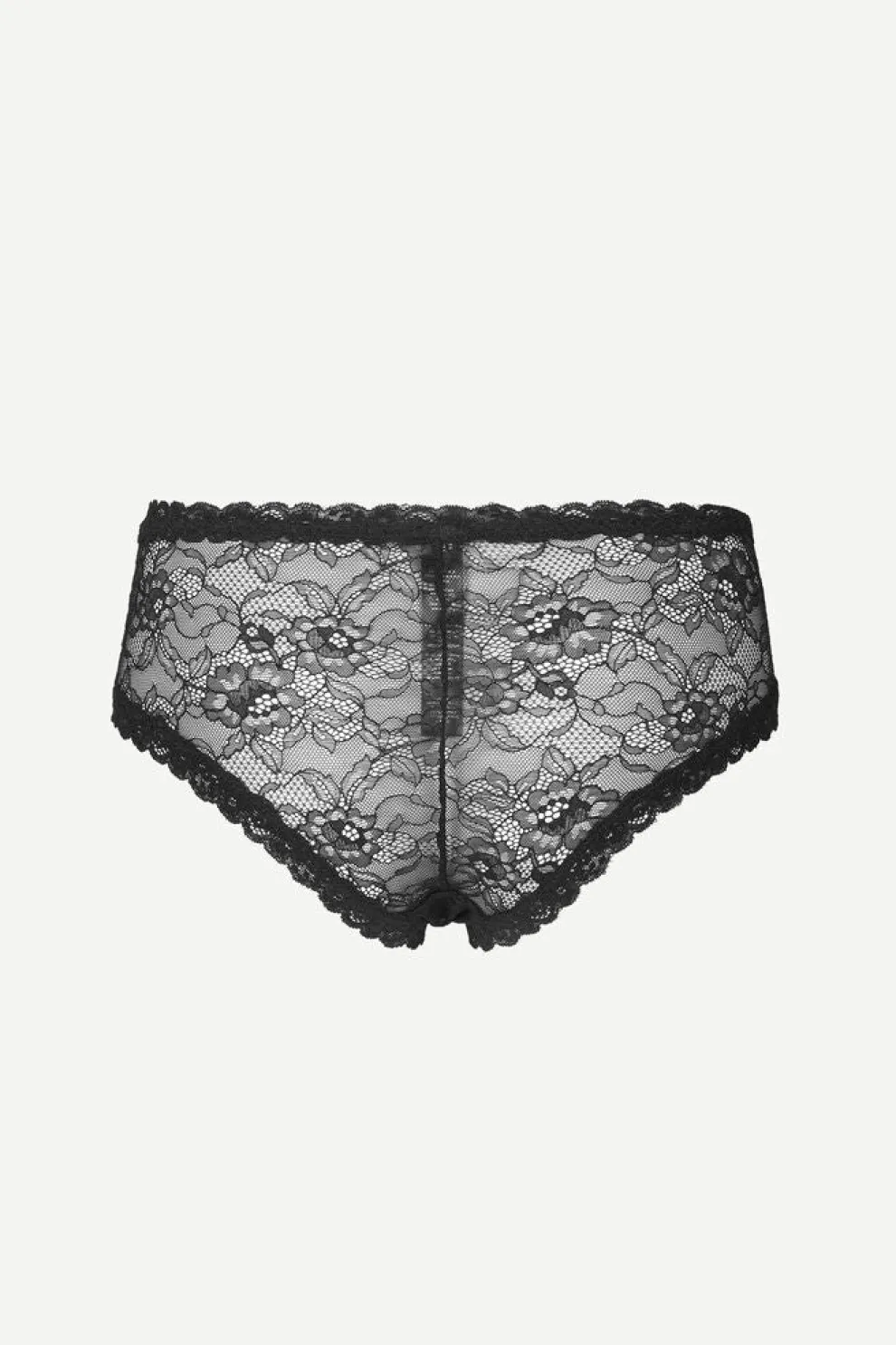 Hipster cut lace panties with scalloped edges. Elastic waist, cotton jersey insert. Patterned stretch lace fabric, blend of polyamide and elastane.