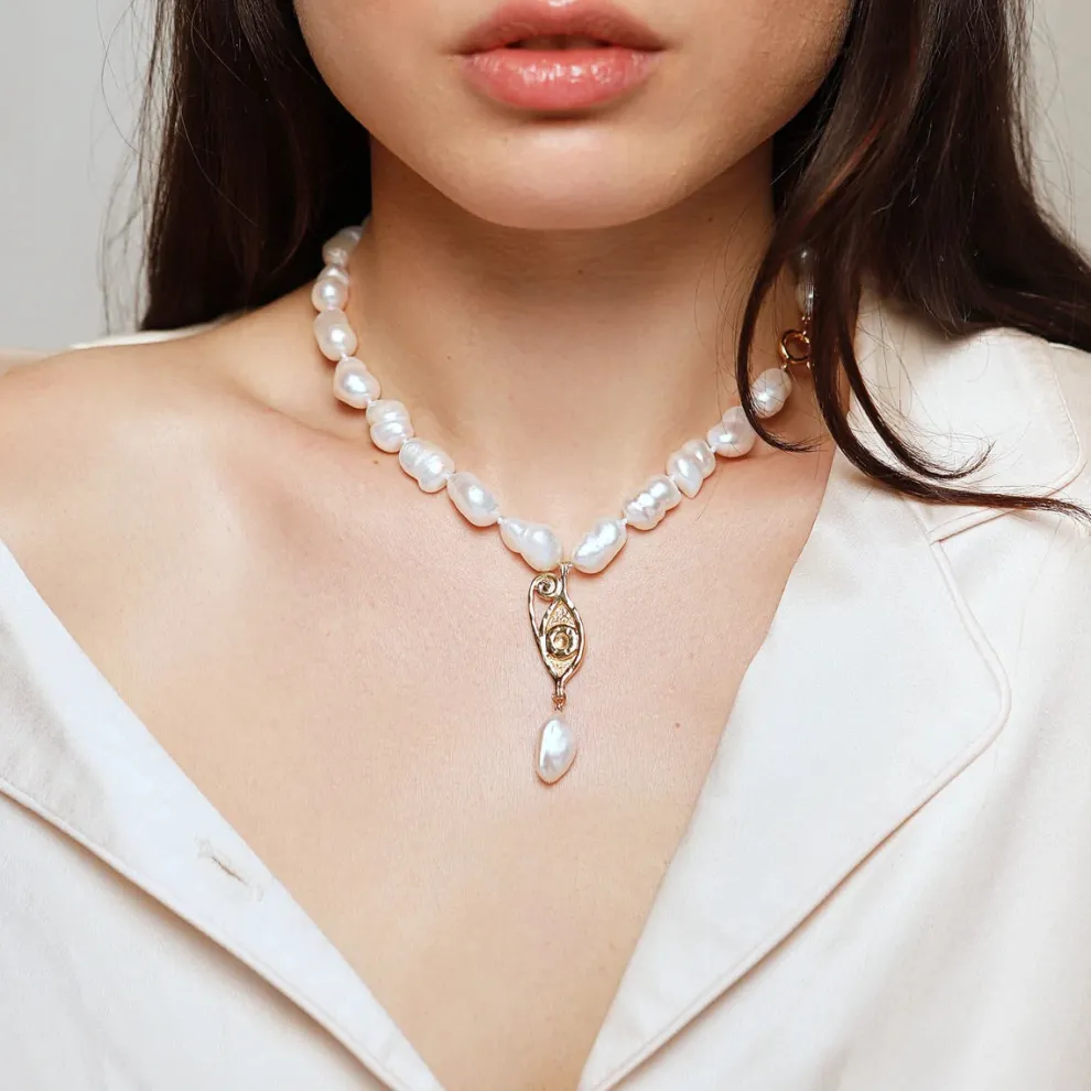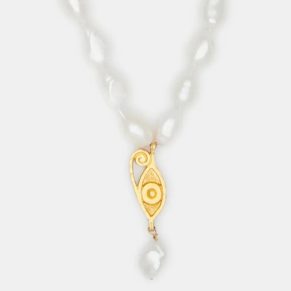 Inspired by the powerful female goddesses of ancient Egypt, the Ayla is always watching over you. Made of genuine baroque pearls. Acting as a third eye, this necklace features a tear of joy crafted from a naturally shaped freshwater pearl.